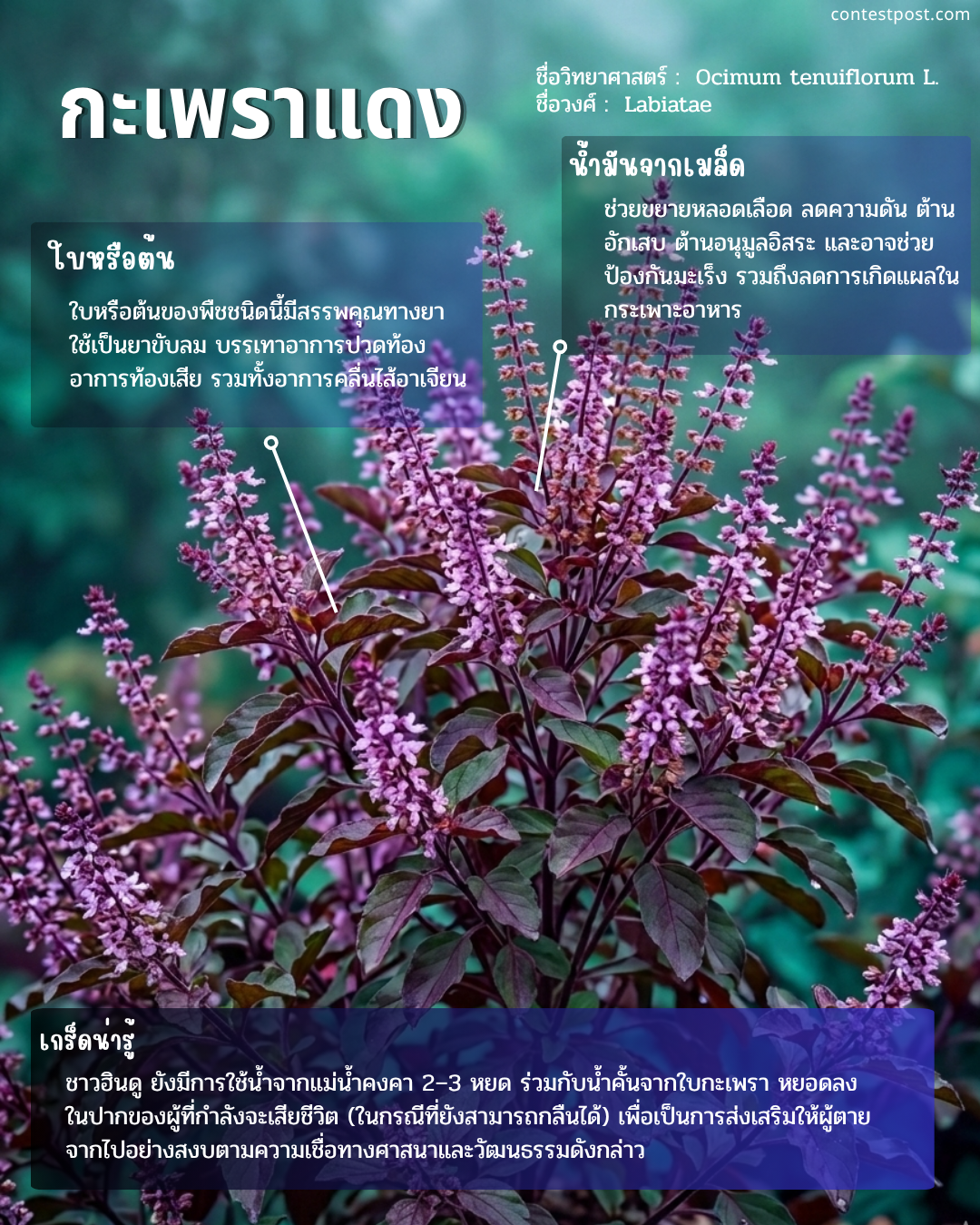 กะเพราเเดง เป็นพืชล้มลุกขนาดเล็ก ลำต้นและทุกส่วนของพืชมีกลิ่นหอมเฉพาะตัว ใบเป็นใบเดี่ยว เรียงตรงข้าม...