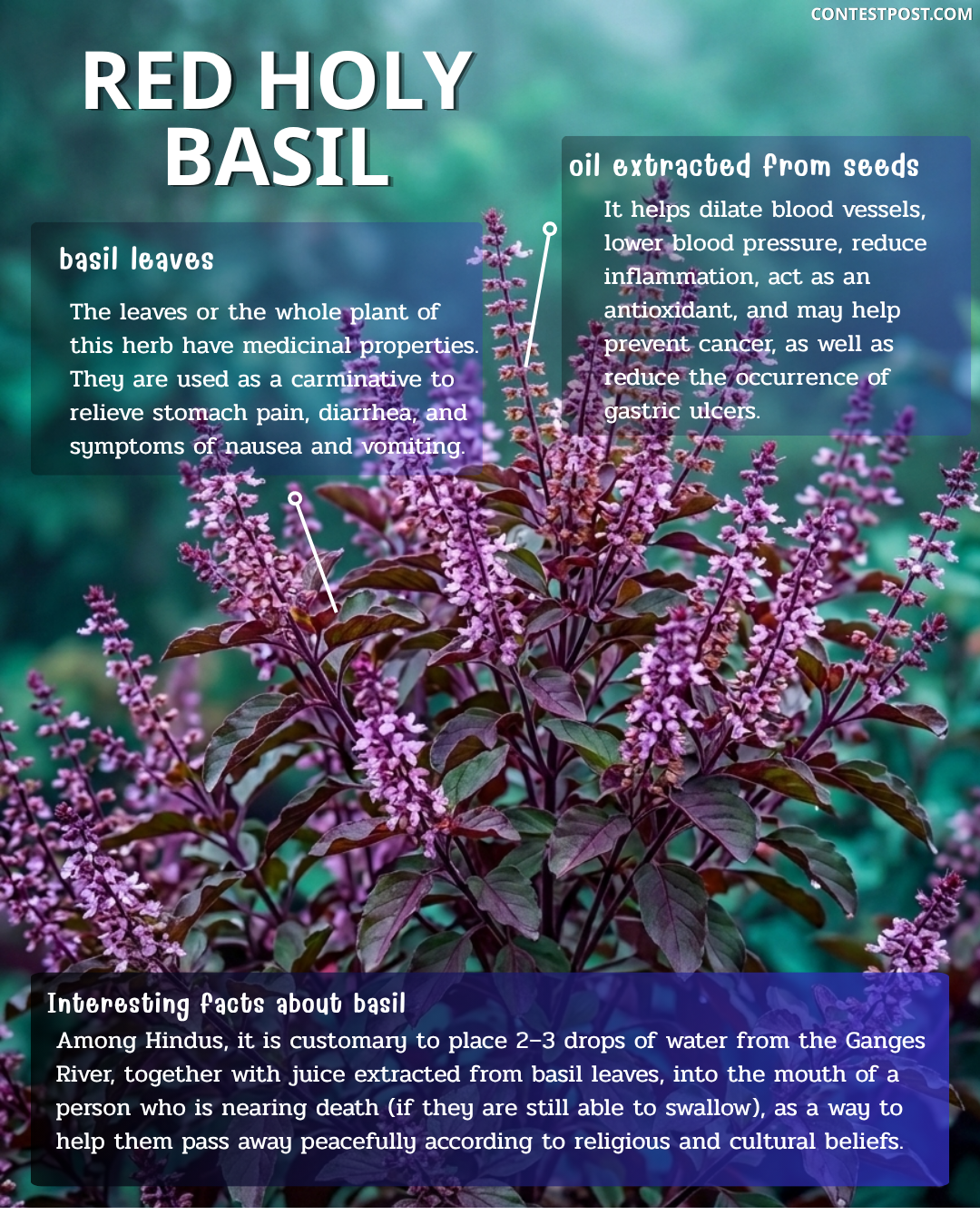 Red holy basil is a small herbaceous plant. The stem and all parts of the plant have a distinctive a...