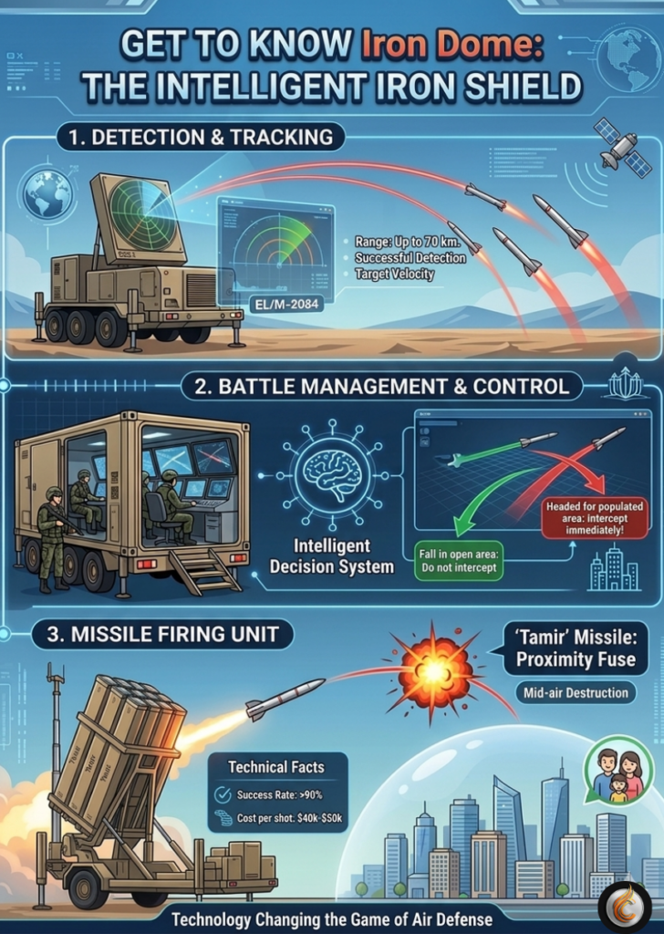 Iron Dome ทำงานด้วยระบบ “ตรวจจับและคัดกรอง” ซึ่งจะเลือกทำลายเฉพาะเป้าหมายที่มีแนวโน้มจะตกในเขตที่อยู่อาศัยหรือจุดยุทธศาสตร์เท่านั้น โดยประกอบด้วย 3 ส่วนหลัก